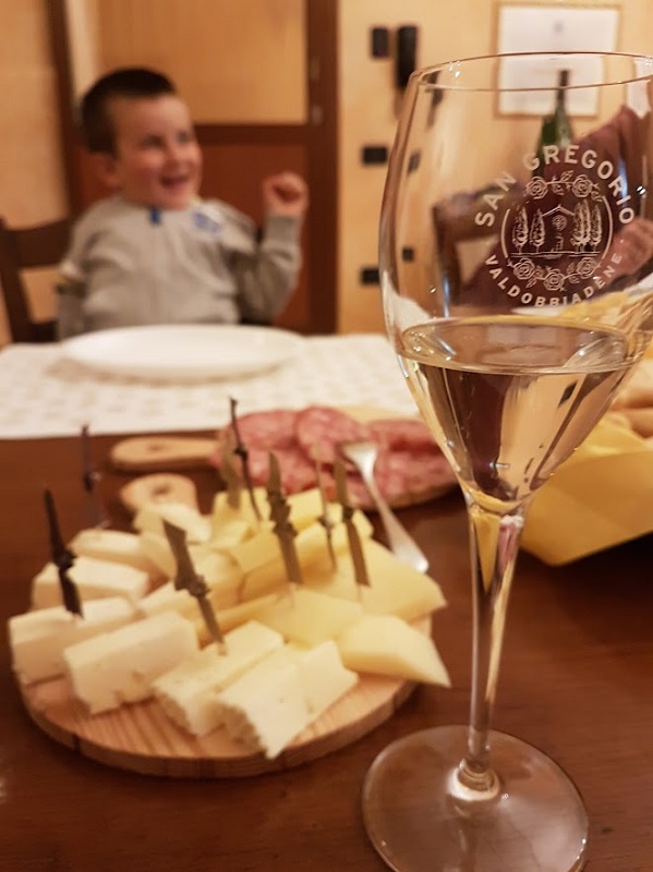 Noi siamo partiti da Valdobbiadene, iniziando con una degustazione presso la Cantina San Gregorio dove una gentile ragazza ci ha fatto assaggiare 4 tipologie di prosecco abbinati a ottimi formaggi e affettati locali (la soppressa con cuore di filetto di maiale me la sogno ancora la notte). Se anche i vostri bambini, come i nostri, sono buone forchette, vedrete che l’esperienza della degustazione sarà una gioia anche per loro. In questa cantina sono presenti anche dei giochi per i bimbi, così se riuscite a staccarli da tavola (è il nostro eterno problema) possono distrarsi e giocare un po’ mentre voi degustate.