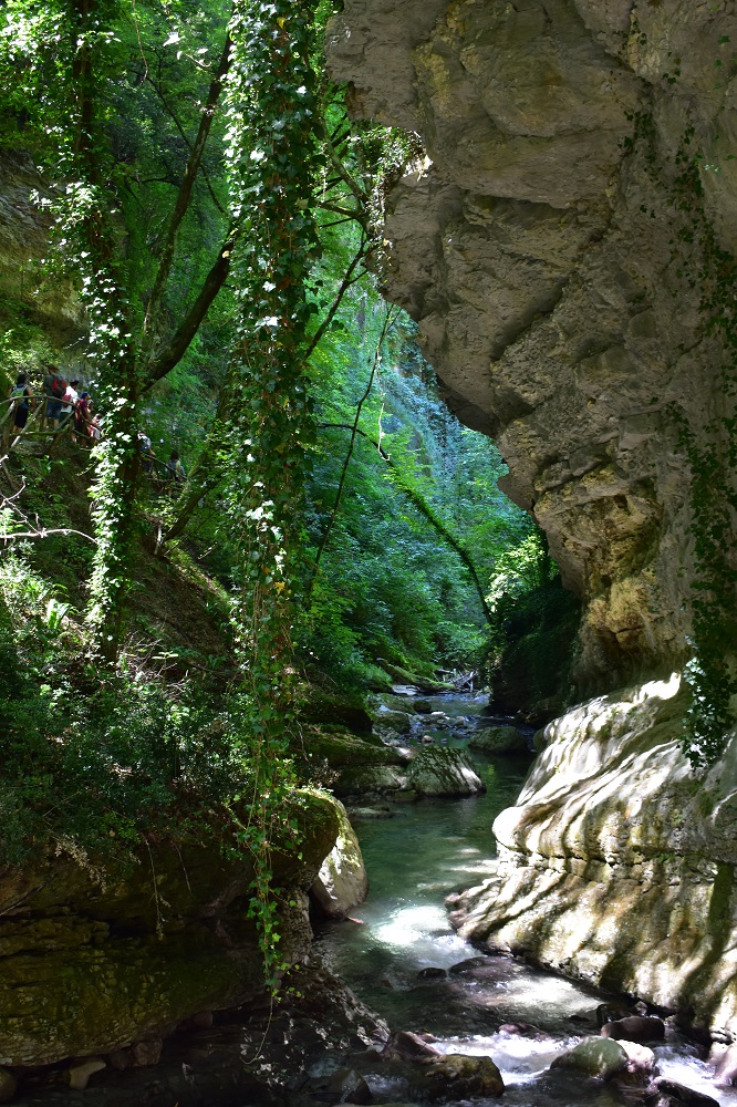 Man mano che si scende nel canyon scavato dall’Orfento, ci si immerge in un ambiente da fiaba. La forza dell’acqua ha scavato pareti rocciose, cascate, grotte e giochi d’acqua. Tutto intorno, una vegetazione verdissima e rigogliosa degna di un libro di fiabe: non sarei stata troppo sorpresa di veder sbucare qualche fata dalle fronde! Uno scenario davvero incantato, con il rumore dell’acqua a fare da sottofondo e il colore verde che domina incontrastato.