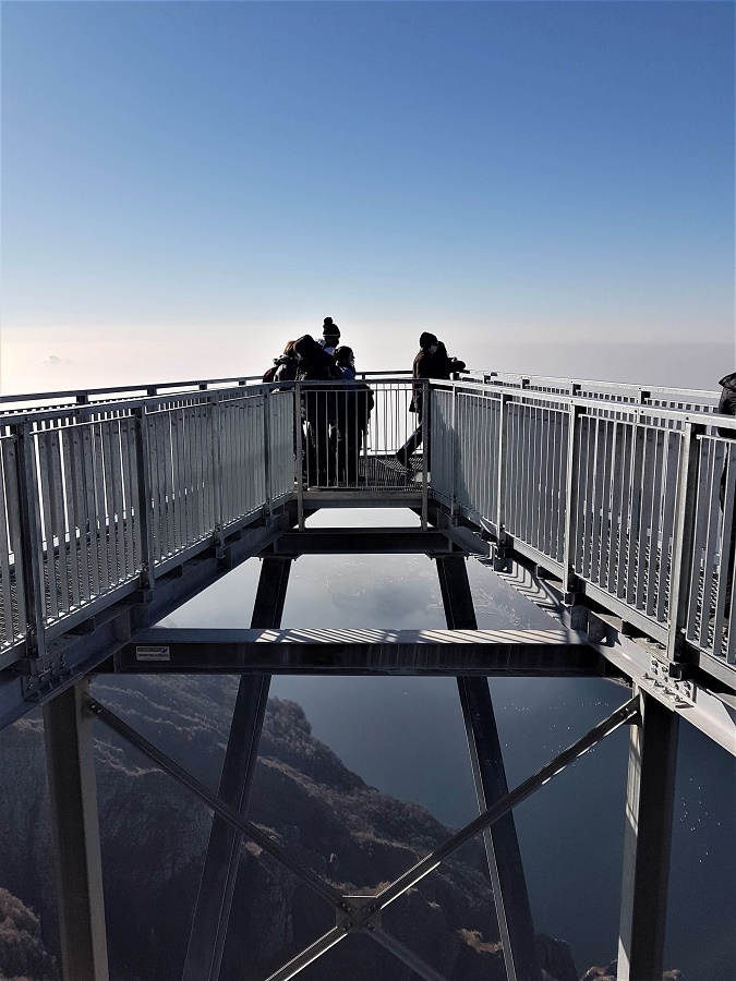 Un balcone che si spinge per qualche metro nel vuoto (non per deboli di cuore!) e da cui si domina il lago sottostante, con la vista che spazia dalle cime delle montagne alle acque blu del lago.