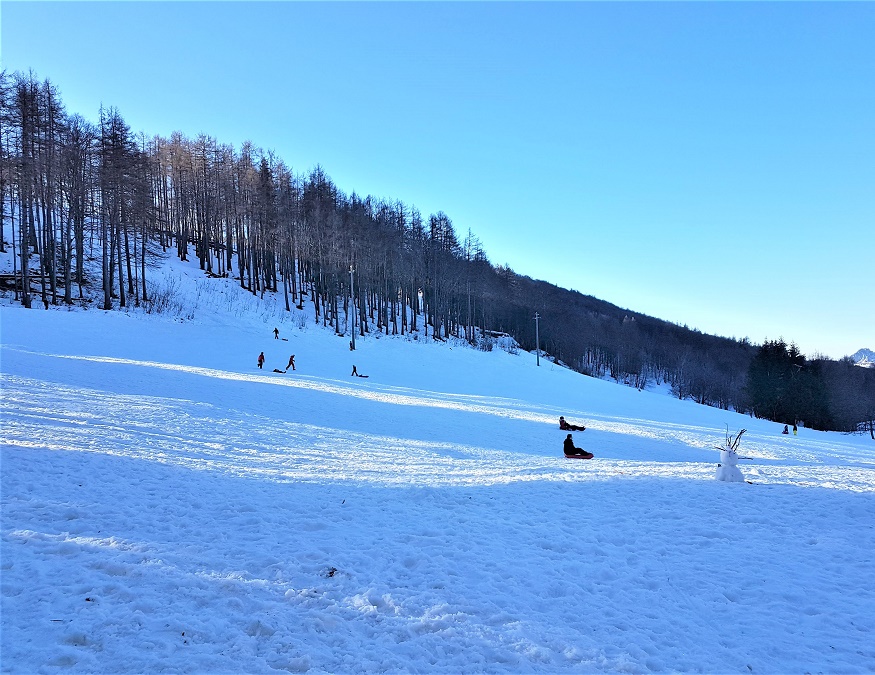 Una volta tornati al punto di partenza, il grande pratone di fronte al parcheggio vi attende per scatenarvi con bob, slittini e padelle.