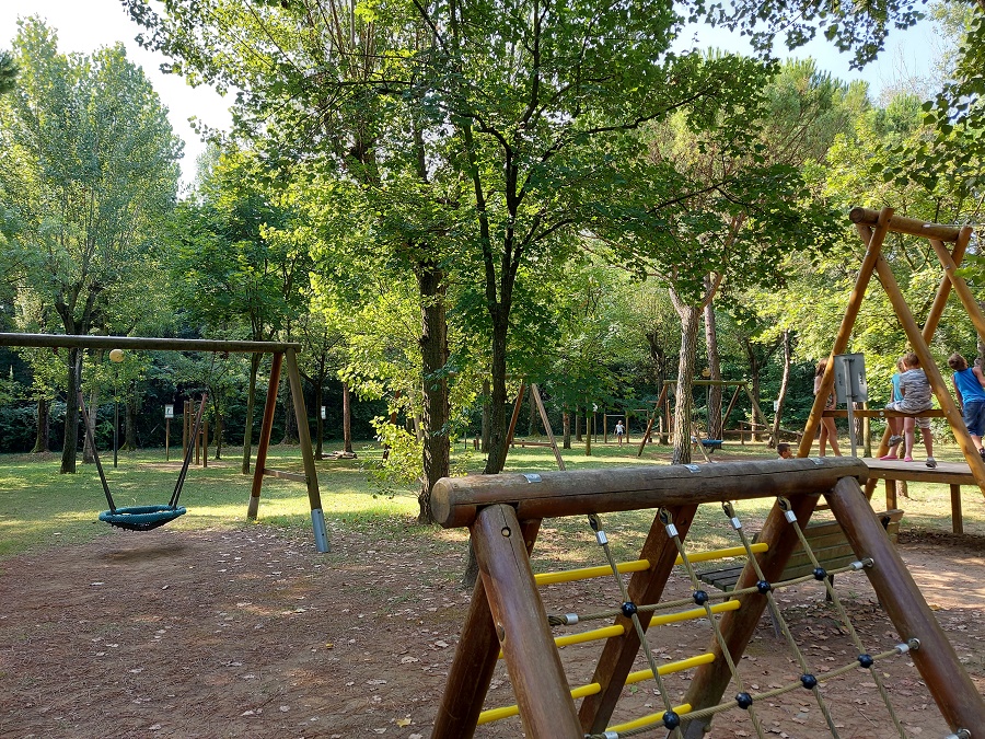 Il parco giochi poi è un gioiellino: tanti bellissimi giochi in legno, immersi nella pineta dove si sta sempre freschi anche quando il sole picchia. Uno dei preferiti è sicuramente la carrucola per lanciarsi da un albero all’altro.