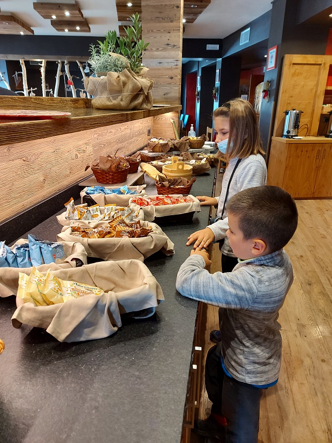 A colazione invece ci sono alcune proposte fresche da prenotare il giorno prima (frutta o croissant), poi c’è il buffet con alcuni prodotti confezionati e diverse bontà fresche: torte, crostate, pancake e anche uova, affettati e formaggi per chi ama la colazione salata. Non so voi, ma la colazione in hotel per me è una delle gioie massime della vita…e poi cosa c’è di meglio di una bella colazione abbondante prima di mettersi in marcia per una giornata all’aria aperta in montagna?