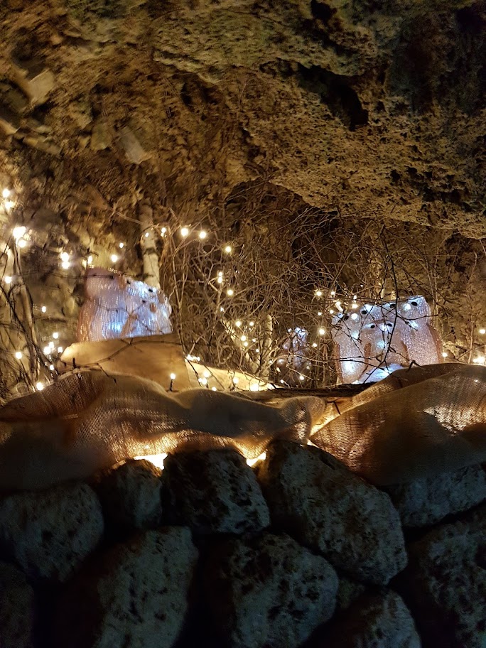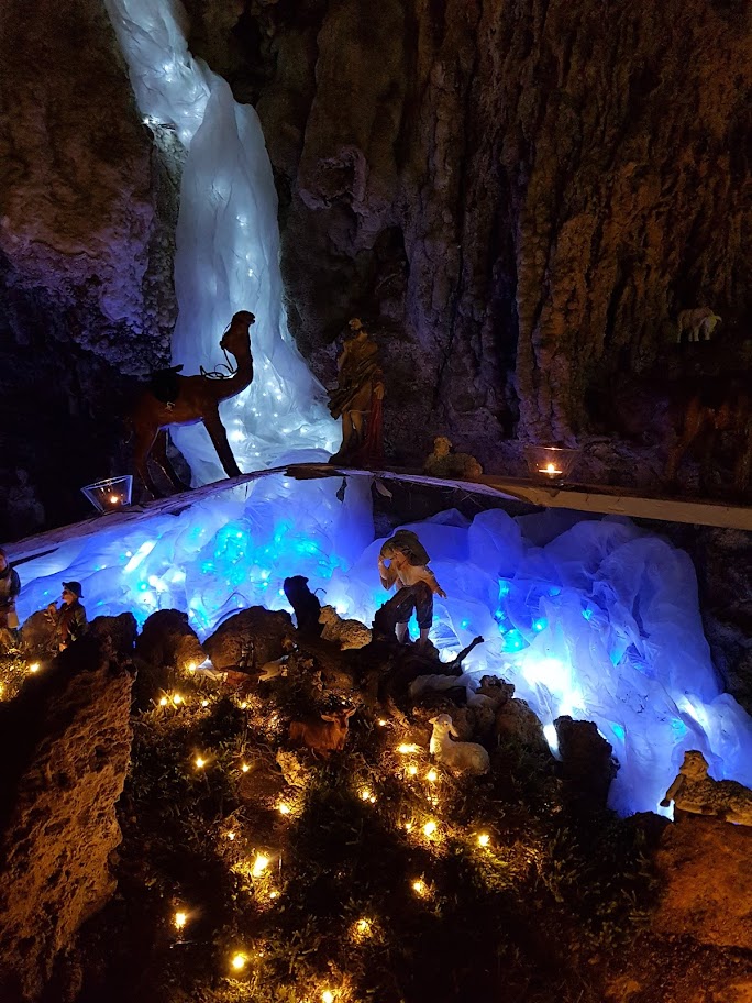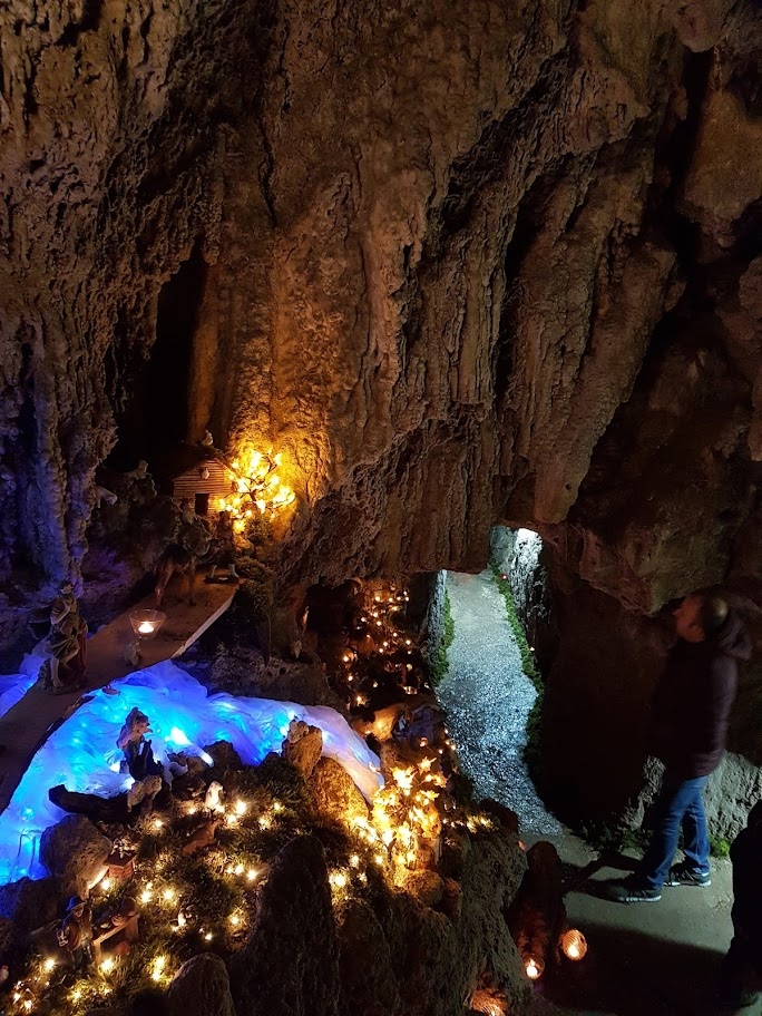 Nelle settimane che precedono e seguono in Natale, le grotte diventano un magico mondo natalizio con allestimenti curatissimi, un’illuminazione suggestiva fatta di lucine e candele, personaggi fantastici e presepi. Il tutto è reso ancora più affascinante dall’acqua che scorre tutto intorno, rendendo l’esperienza davvero unica nel suo genere.