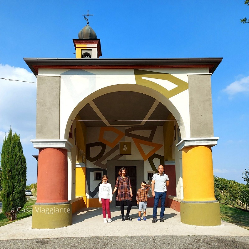 Restando a Coazzolo e in tema “colori”, a due passi dalla vigna dei pastelli non potete non fermarvi ad ammirare una delle chiesette colorate dell’artista David Tremlett.