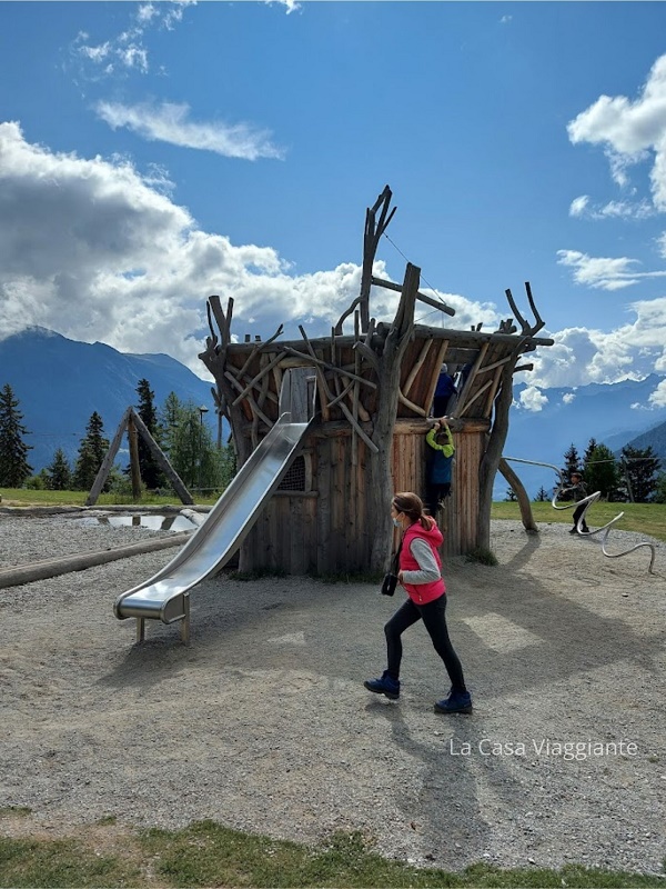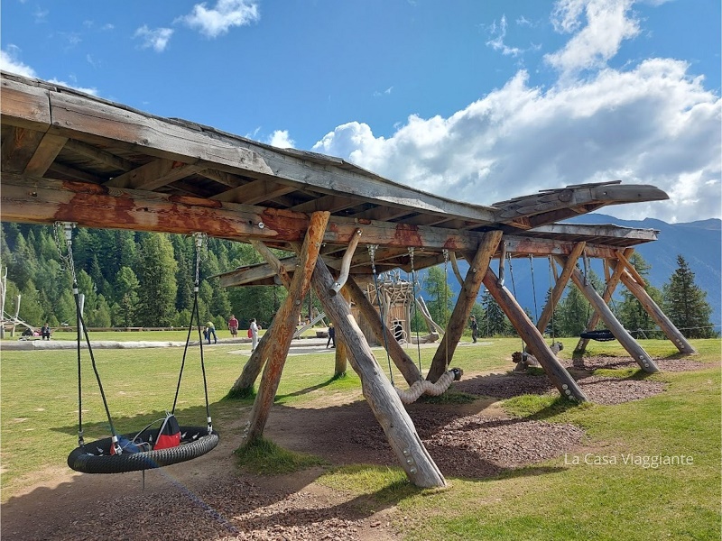 E poi un vascello con scivoli, una paretina per arrampicare, la carrucola e le particolari altalene sovrastate da un’aquila gigante in legno. Capito perché ci sono anche delle fantastiche amache per rilassarsi nel prato con vista sulle montagne? Perchè lo sapevano che qui i bambini avrebbero giocato per ore, così i genitori intanto si possono rilassare senza mai perderli di vista.