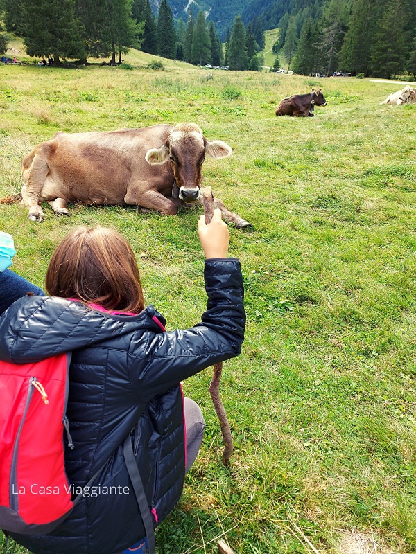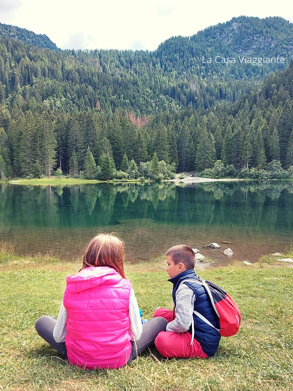 Continuando lungo il sentiero, si raggiunge infine il laghetto di Covel. Non aspettatevi un grande bacino: si tratta di un laghetto piccolino, ma che sa regalare dei riflessi e degli scorci davvero incantevoli! Un piccolo angolo incantato tra prati e montagne, dove godersi un momento di pace (scherzo ovviamente. Quale pace quando sei con i bambini?).