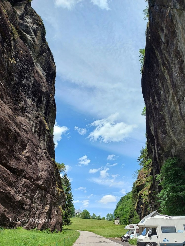 Un’altra opzione, che richiede un po’ più di cammino ma pone meno problemi a livello di strade e parcheggio, è piazzare il camper nell’area sosta comunale di Baceno e raggiungere gli Orridi di Uriezzo a piedi (circa un’ora di cammino).