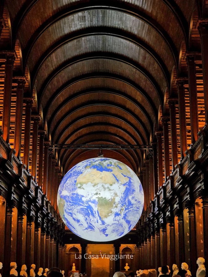 Quest’ultimo è un’installazione tridimensionale realizzata con immagini dettagliate del pianeta Terra provenienti dalla NASA, che sembra fluttuare sospeso nel vuoto all’interno dello spazio della Long Room, attualmente oggetto di un’imponente opera di restauro. L’opera ha lo scopo di far riflettere sul tema della sostenibilità e della tutela dell’ambiente: un patrimonio collettivo, tanto importante quanto fragile – proprio come il patrimonio custodito nella Old Library. Al momento della nostra visita infatti, quasi tutti gli scaffali della libreria erano vuoti: questo perché i libri – molti dei quali dalla storia millenaria, e che sono stati custoditi qui per oltre quattrocento anni – sono al momento in fase di restauro, per permettere alle generazioni future di continuare a godere di questo patrimonio unico. Il progetto di riqualificazione della Old Library dovrebbe continuare fino ad inizio 2025: fino ad allora è comunque possibile visitare la libreria, anche se quasi tutti gli scaffali sono vuoti. A suo modo è un colpo d’occhio notevole anche questo, nonché un momento storico unico nella storia della Old Library.
