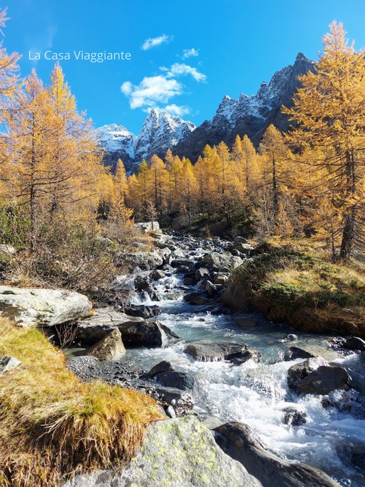 Ruscelli e torrenti, cime imbiancate, passerelle e ponticelli di legno, e tutto intorno i boschi di larici che in autunno si accendono in un’esplosione dorata. Un foliage da batticuore, che emoziona e ti fa sentire come dentro ad un dipinto.