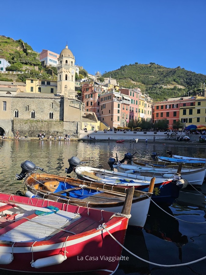 Vernazza sorge in posizione decisamente scenografica su uno sperone roccioso che si protende nel mare, con il porticciolo circondato dalle tipiche case-torre colorate e sviluppate in verticale.