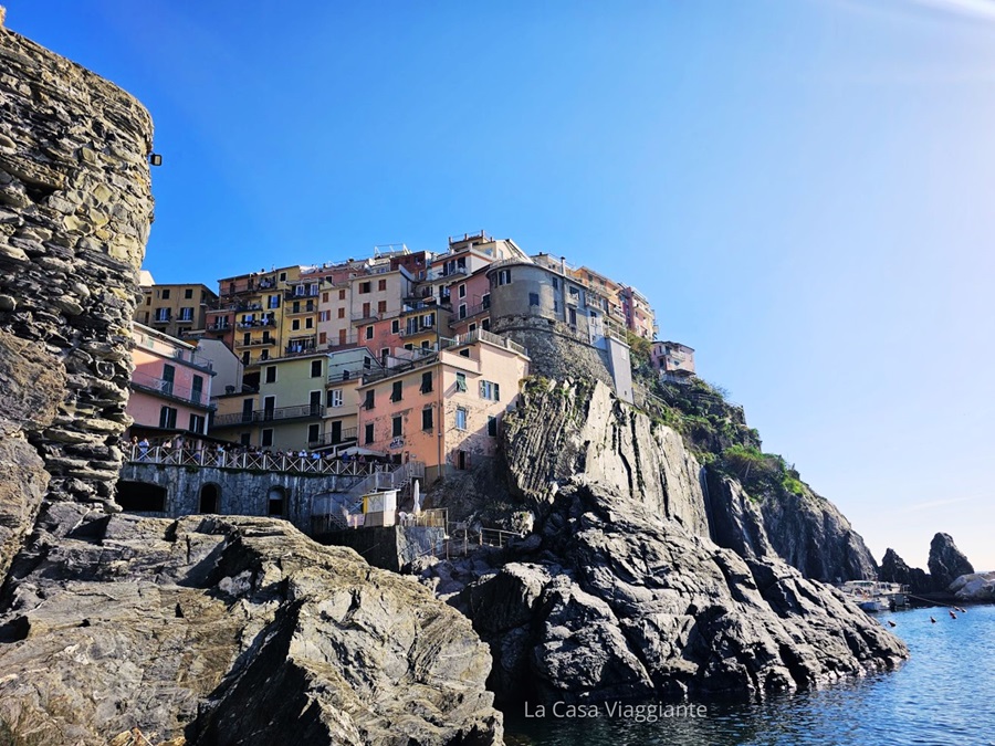 Manarola è arroccata su un promontorio di roccia scura, con il porticciolo racchiuso tra due speroni rocciosi. Anche qui troviamo il tipico dedalo di viuzze strette e scalinate che passano tra le case.