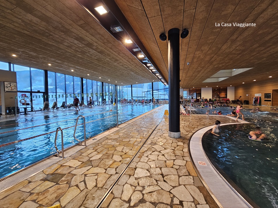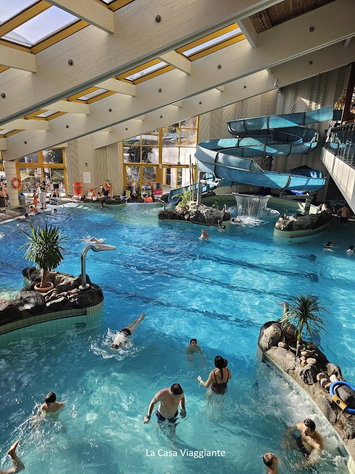 Qui si può sguazzare nelle piscine indoor – ce ne sono una più grande con scivolo, e una per i più piccolini – rilassarsi nella vasca idromassaggio termale e nella vasca salina a 36°,