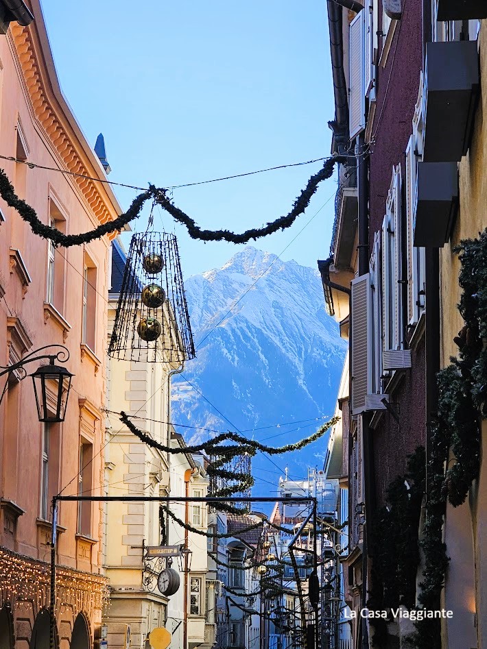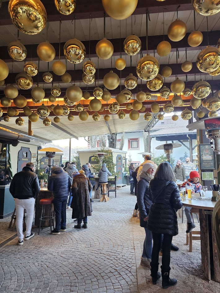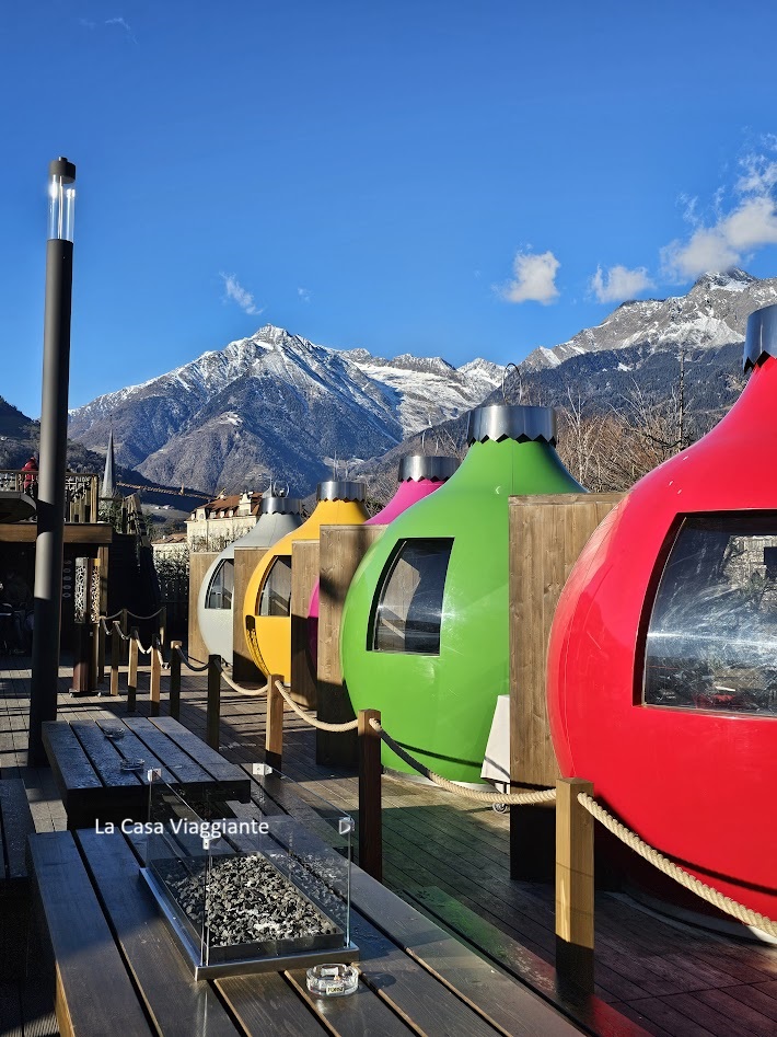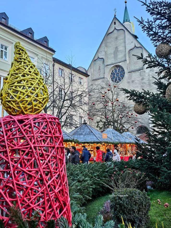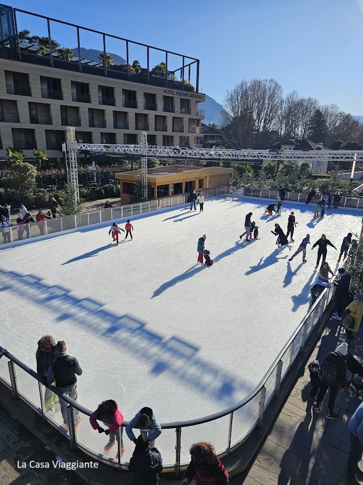 Passeggiando sul lungofiume verso piazza Terme, si incontrano le decine di casette di legno dei mercatini natalizi, con tanti prodotti artigianali ed enogastronomici, mentre il profumo di vin brulé riempie l’aria. Anche Piazza Terme si trasforma in un magico paese delle meraviglie natalizio, dove si può pattinare sul ghiaccio e pranzare o cenare nelle Kugeln, le palle di Natale giganti che si trovano accanto alle terme.