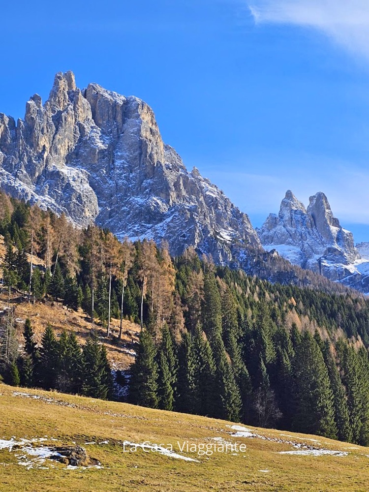 La seconda passeggiata che vi consiglio è facilissima, ma vi condurrà davanti ad un panorama che vi lascerà senza parole e vi resterà incollato alla memoria: si parte da San Martino, in località Col, e si imbocca il sentiero verso Maso Col. Basteranno pochi minuti di cammino, in leggerissima salita lungo un sentiero semplice e adatto a tutti, per ritrovarsi letteralmente al cospetto delle Pale di San Martino in tutto il loro magnifico splendore. Per quanto mi riguarda, uno dei panorami più belli che ho mai avuto la fortuna di ammirare: mi sono emozionata!
