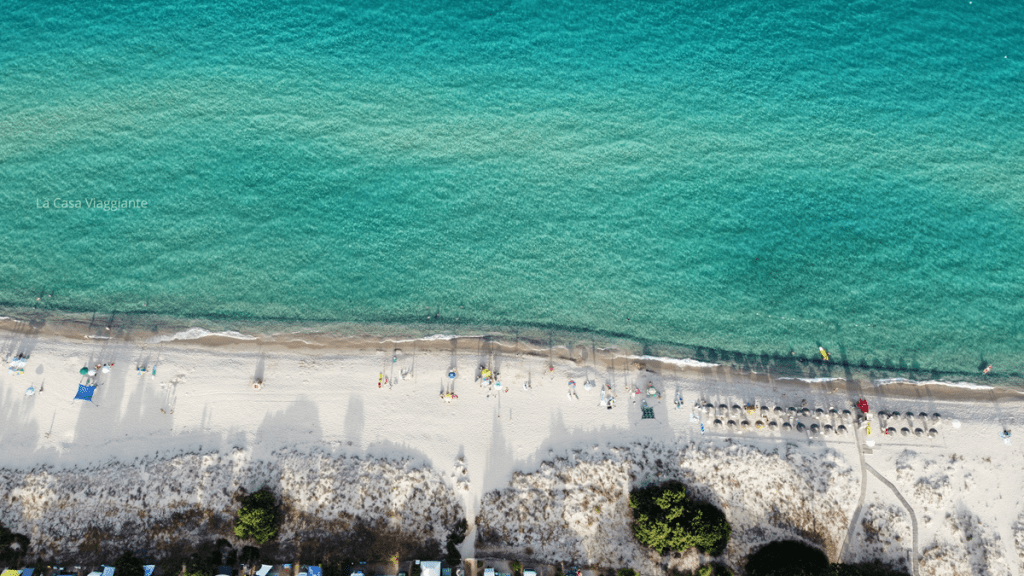 Si chiama Capo Ferrato, perché in origine era stato aperto proprio a Capo Ferrato – ma in realtà si trova leggermente più a sud, proprio sulla spiaggia dello Scoglio di Peppino. Una lunga lingua di sabbia fine e dorata, affacciata su un mare che, quando siamo arrivati qui, ci ha lasciato a bocca aperta con il suo turchese quasi irreale.