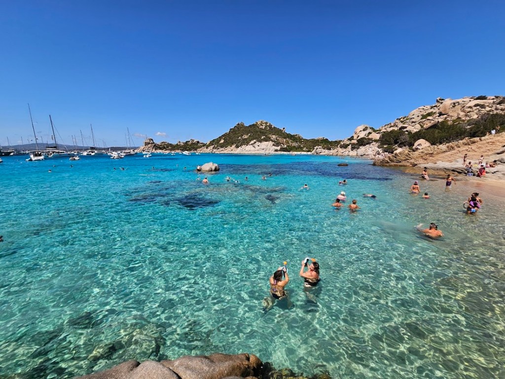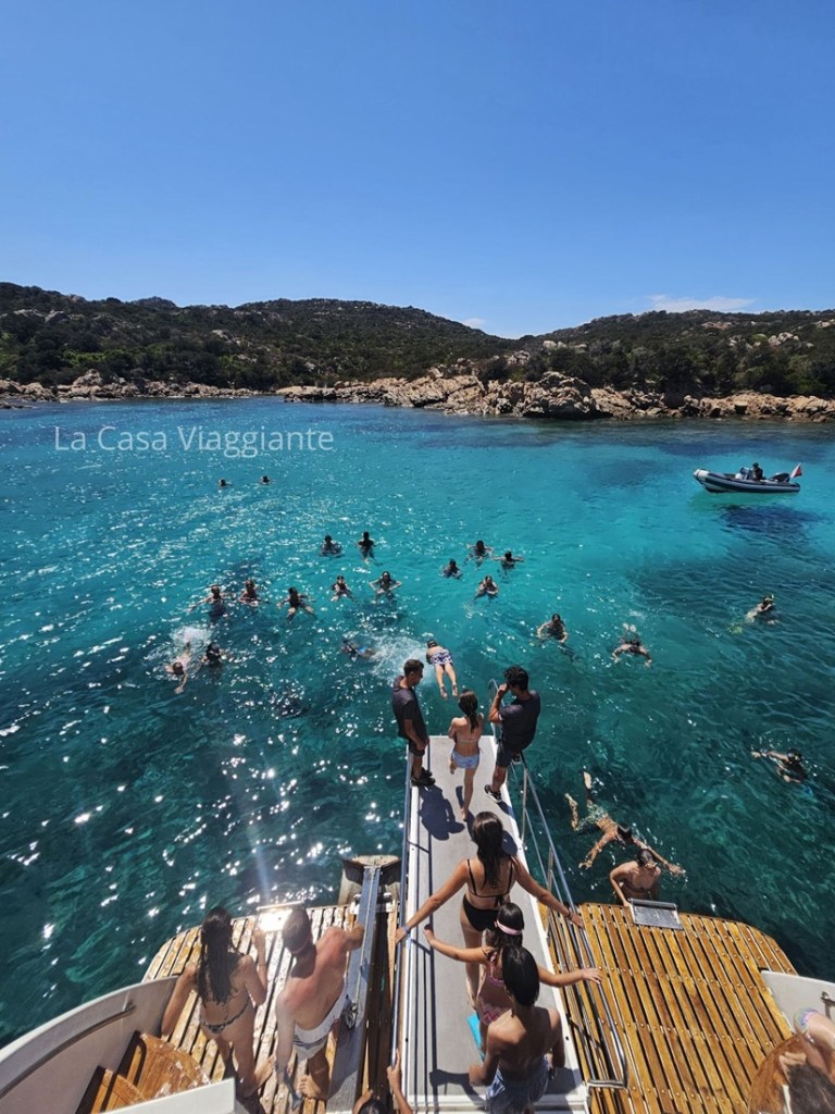 Poi si risale a bordo e si prosegue verso la seconda tappa, alle piscine naturali dell’Isola di Budelli. Qui ci si ferma a fare il bagno senza attraccare, tuffandosi direttamente dalla barca in quest’acqua dai colori irreali, circondati dai pesci. Inutile dire che ci siamo divertiti un sacco!