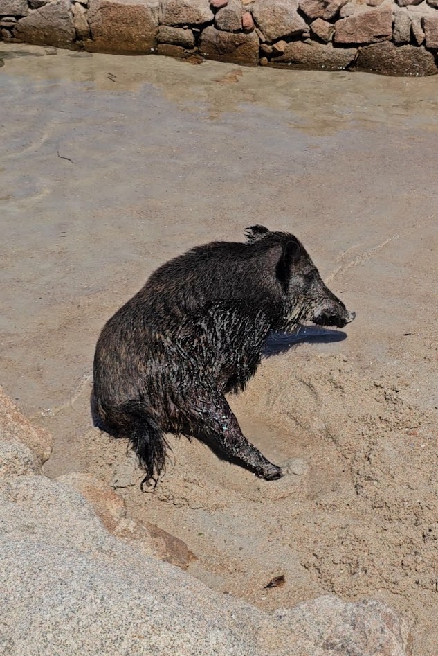 Attenzione ai cinghiali: qualcuno si aggira in spiaggia, facendosi anche bagni e sonnellini (bella vita) – ma bisogna fare attenzione perché vanno alla ricerca di cibo, e possono diventare abbastanza decisi quando lo fiutano in borse, zaini e sacchetti. Loro finiscono mezzi distrutti, e voi restate senza pranzo, quindi meglio lasciare tutto il cibo sulla barca, come giustamente raccomandato da personale di bordo.
