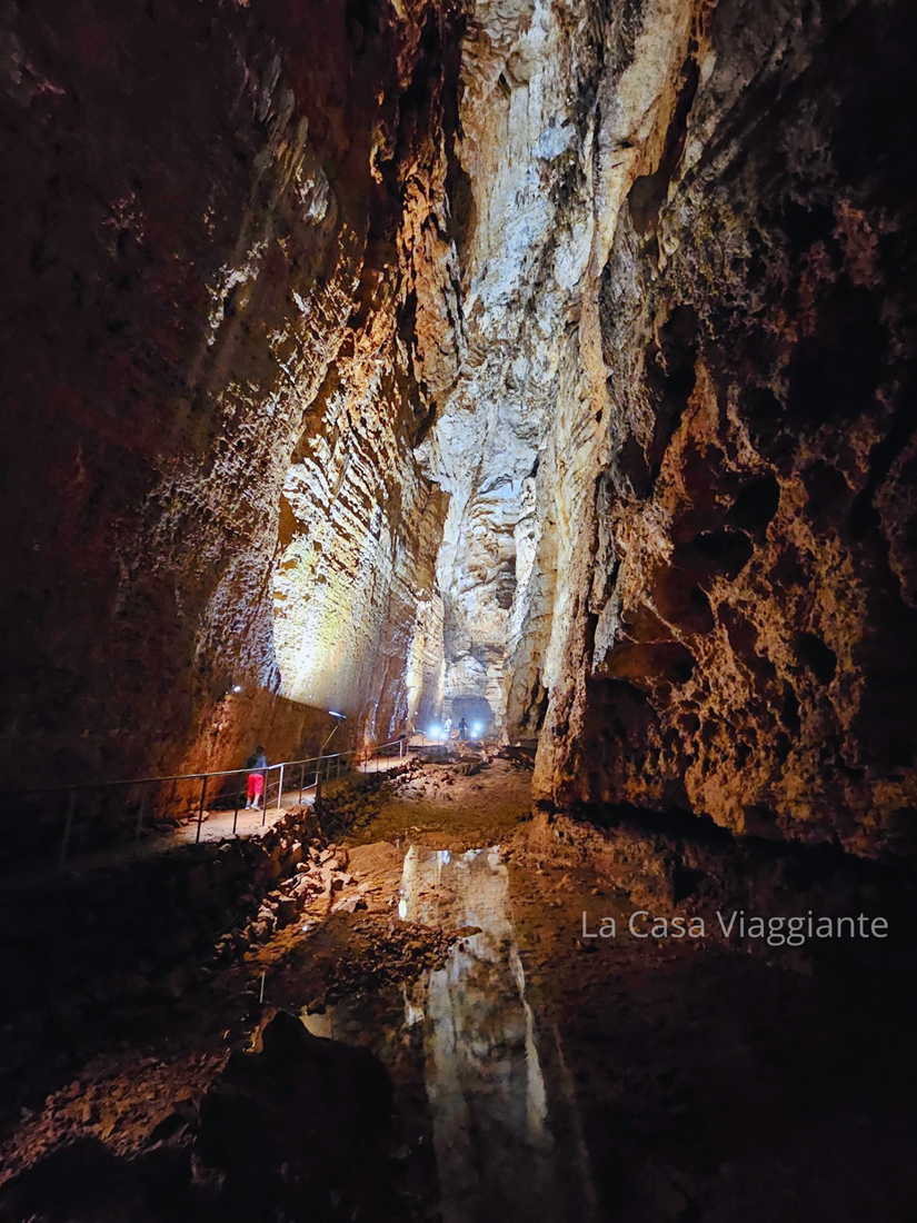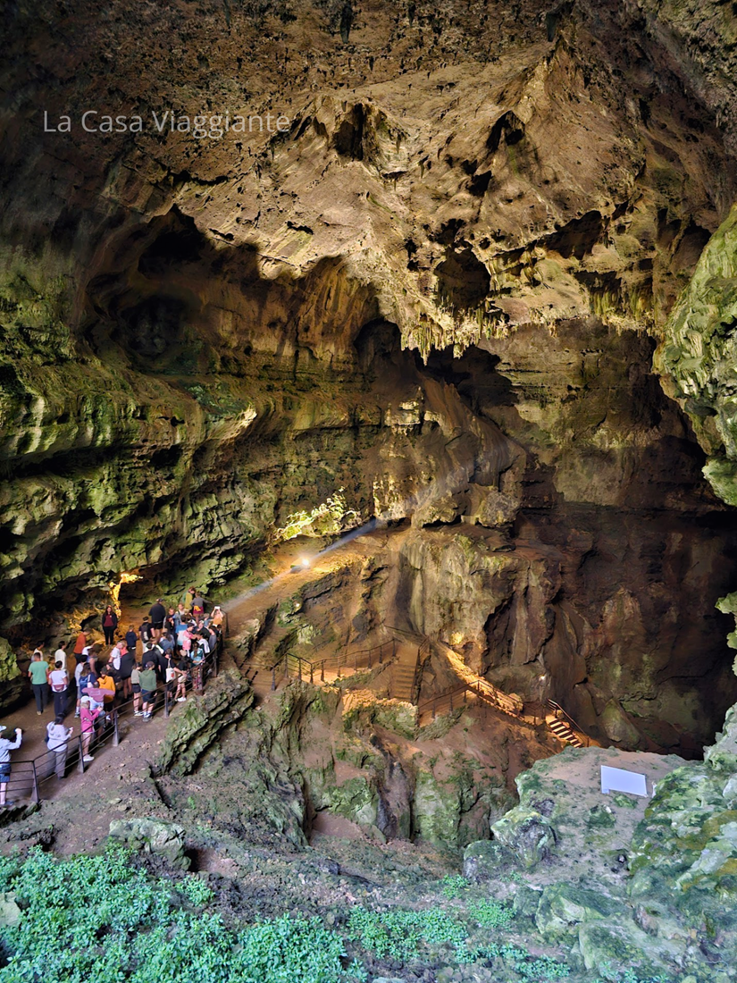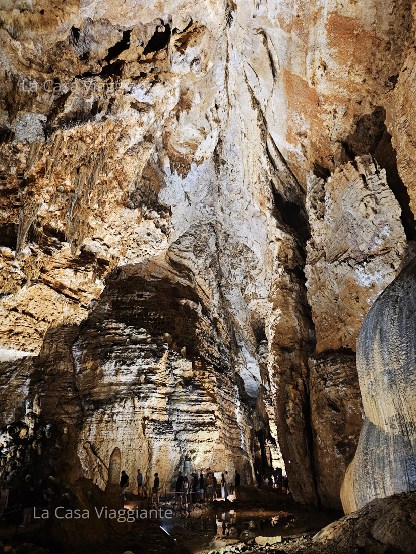 Scendendo le scale che portano all’interno, la temperatura cala improvvisamente di diversi gradi e la sensazione è quella di scendere nelle viscere della terra. Ci si sente subito piccoli di fronte a sale immense, stalattiti e stalagmiti monumentali, modellate nel corso di millenni dal paziente lavoro dell’acqua e del vento. Un ambiente silenzioso e quasi irreale, dove il tempo sembra sospeso.