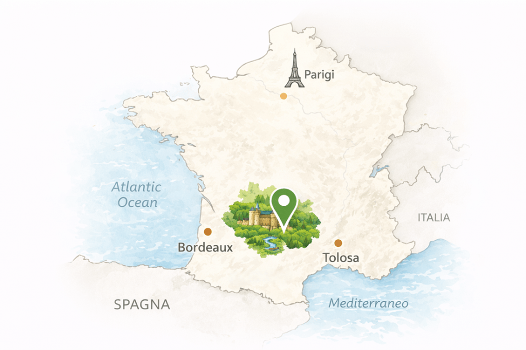 La Dordogna, conosciuta anche come Périgord, si trova nel sud-ovest della Francia, all’interno della regione Nuova Aquitania. È una zona prevalentemente rurale e verde, situata a est di Bordeaux e a nord di Tolosa, lontana dalle grandi città e dal turismo di massa. Non si affaccia né sul mare né sui grandi assi autostradali, ed è proprio questo isolamento “dolce” a renderla così affascinante: colline boscose, fiumi tranquilli come la Dordogna (che dà il nome alla regione) e la Vézère, piccoli borghi in pietra e castelli medievali disseminati nel paesaggio.